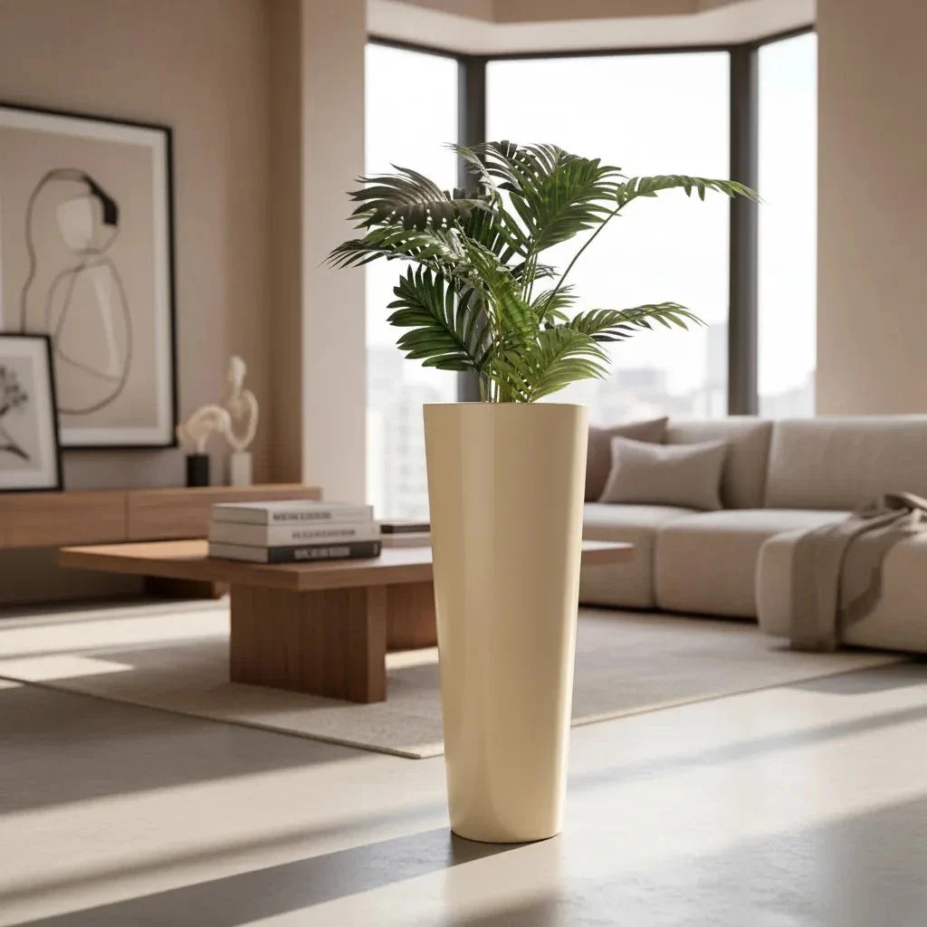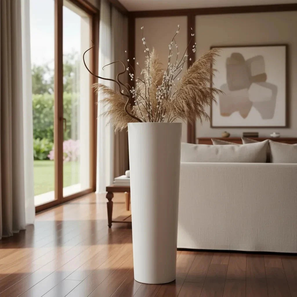 O design em coluna apresenta sensação de verticalidade e elegância, sendo perfeito para composições modernas e minimalistas. Um vaso que funciona como elemento decorativo por si só, elevando o nível do ambiente com praticidade e estilo